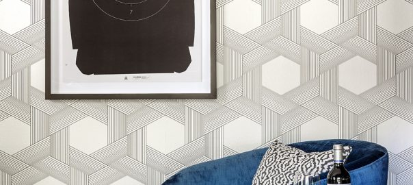 This original piece is straight from the gallery and adds a pop of high-end, graphic fun to the Dining/Kitchen area — exactly the feel we were going for with this casual dining area next to the built-in bar in the Contemporary Warmth project.