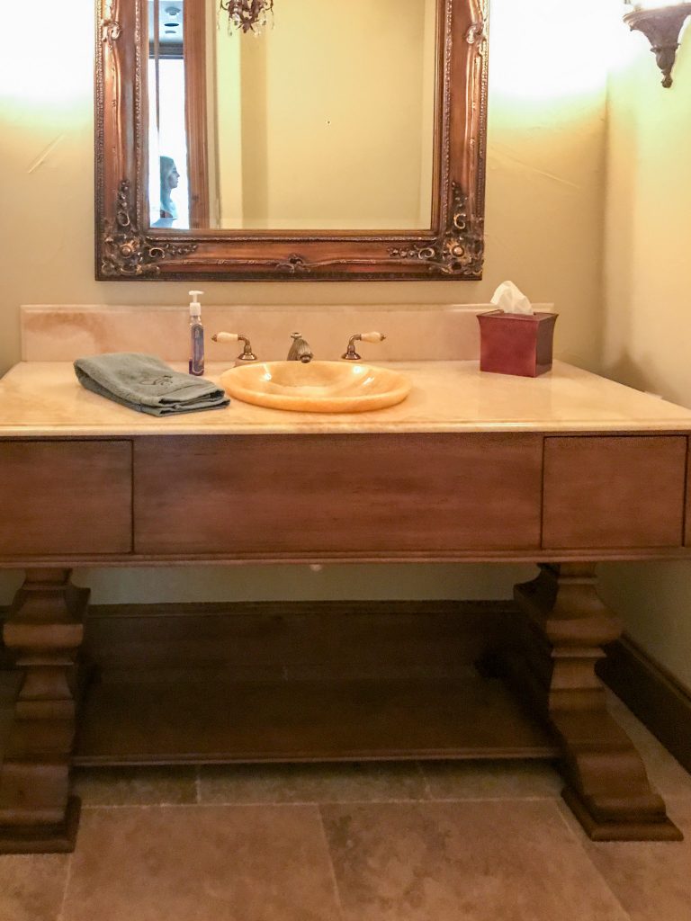 Even the adjacent powder bath was given the same sophisticated style as the entertainment lounge. We turned up the drama with Venetian plaster and geometric marble floors.