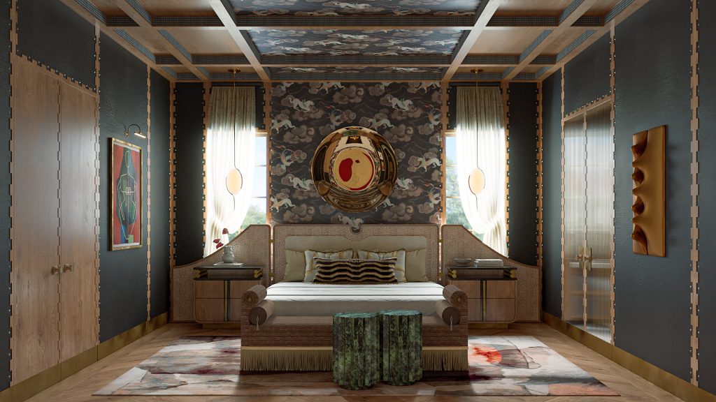 - A coffered ceiling with a surreal mural that adds movement and depth