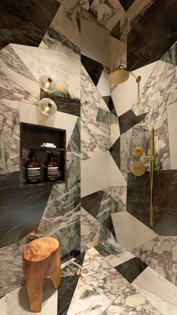 The geometric stone installation—a mix of marbles cut and composed into a fractured pattern—turns the entire space into an experience.