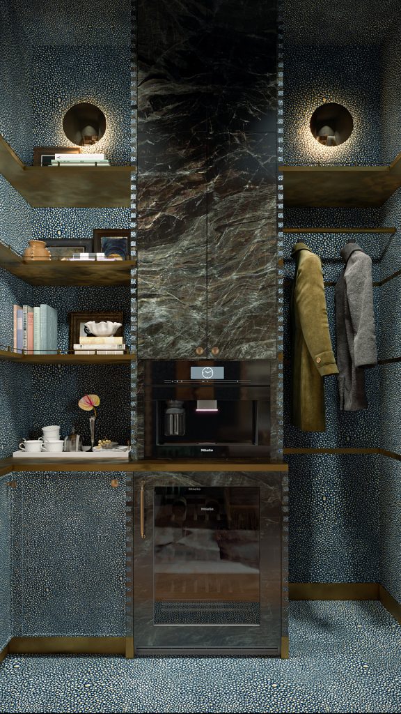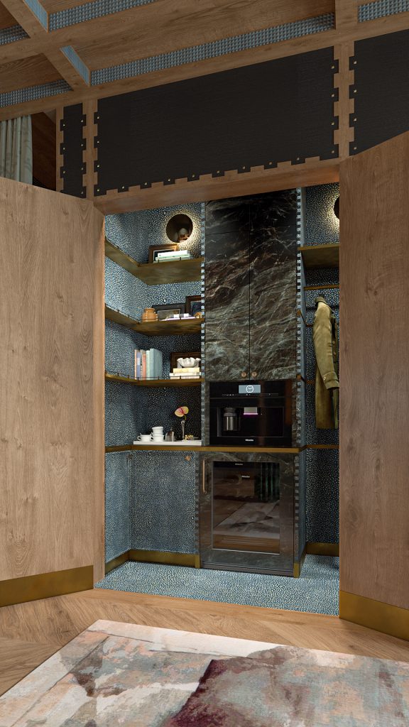 Behind custom doors, we integrated a coffee bar with Miele appliances, allowing guests to move through their morning without leaving the suite.