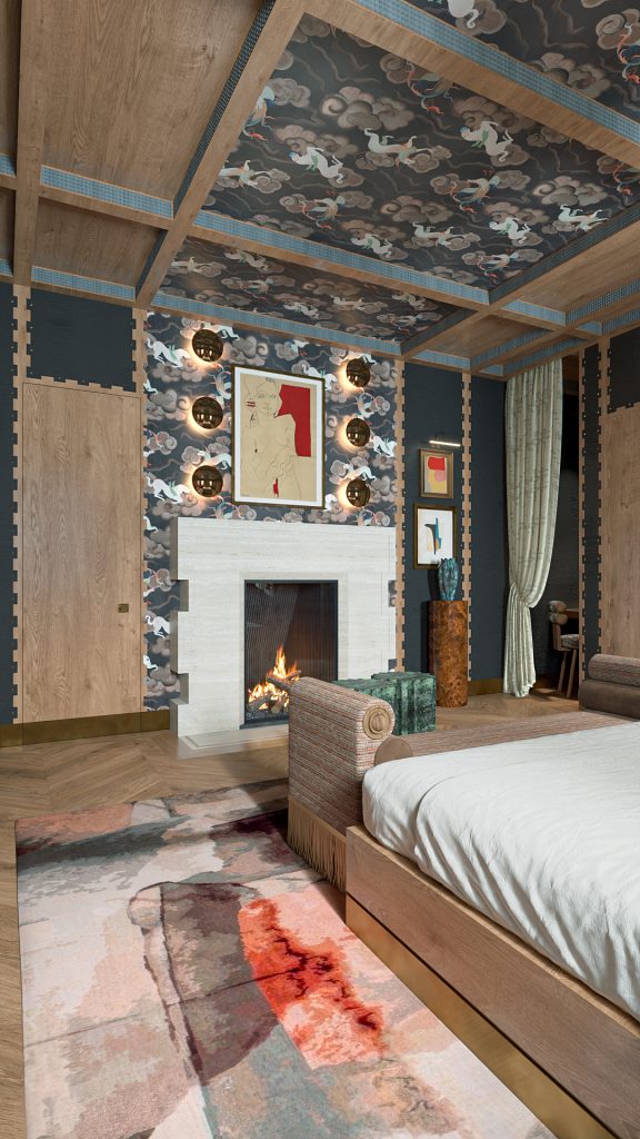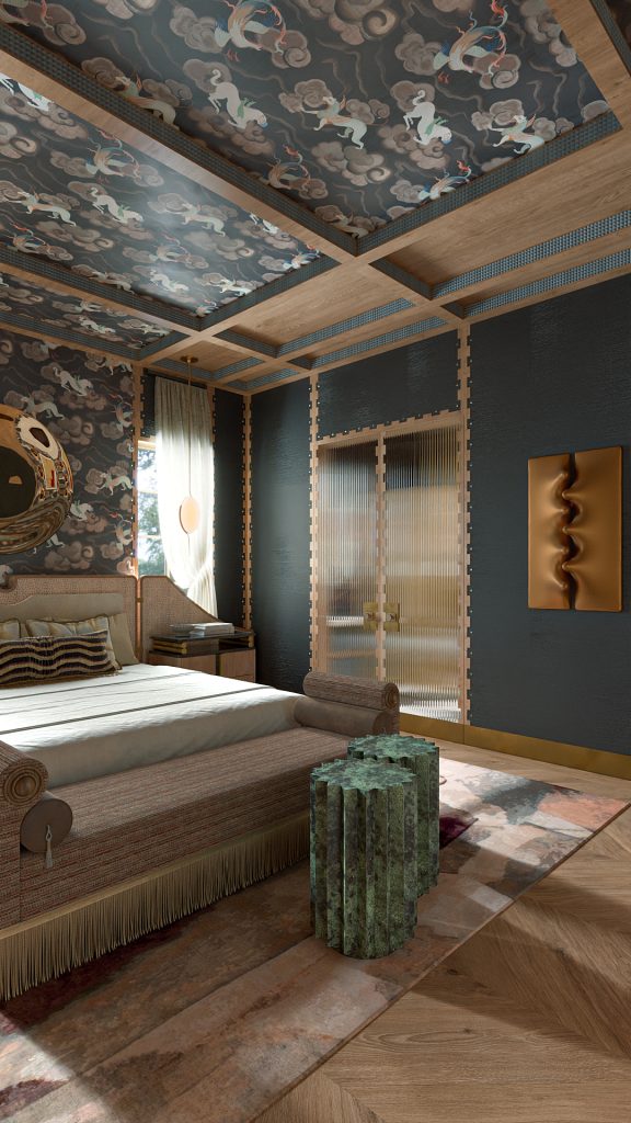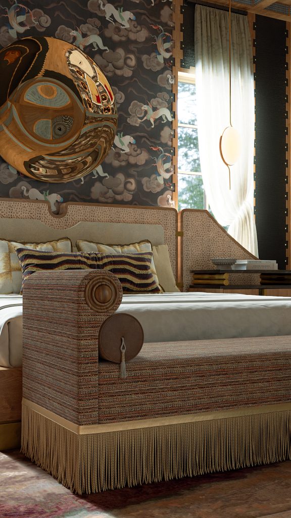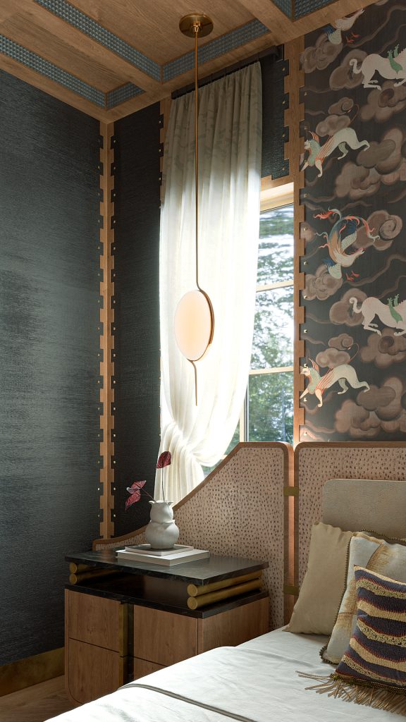 We designed the bedroom to feel like an escape from the rest of the home—moody, layered, and slightly unexpected.